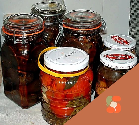 У кожну 1-літрову банку налийте по 0,5 склянки оцту і залийте гарячим маринадом до верху, не шкодуйте, залийте його ретельно, навіть хай маринад трохи витече з банки. Перепрошую за погану якість фото - я була вдома одна, і заливати окропом, фокусуватися і знімати виявилося складно, якщо не було третьої руки. Щоб маринад не розливався навколо вас, має сенс поставити банку, яку ви наповнюєте, в тарілку. Після наповнення банки її потрібно відразу ж закрити і перевернути. Нехай займається йогою - встане на голову, тобто на кришку. Так як я приготувала маринаду трохи більше, ніж потрібно, довелося ще й закрити відро з помідорами і дві маленькі баночки, в яких я маринувала обрізки баклажанів. Частина обрізків пішла на фарш. Решта стане самостійною закускою. У банки з помідорами і шматочками баклажанів кладу гілочки кропу, селери і кінзи, часник, горошини перцю, гвоздику, лавровий лист.
