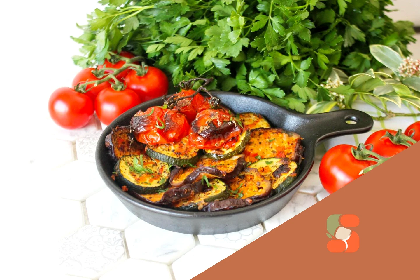 : Відправте овочі в розігріту духовку запікатися на 20-30 хвилин, потім увімкніть режим конвекція і залиште баклажани з кабачками ще на 5 хвилин для легкого зарум'янювання (втім довести овочі до готовності можна на звичайному режимі). Точний час та температура залежать від вашої духовки. Дізнатися про особливості роботи духовок можна, прочитавши окрему статтю, посилання наприкінці рецепту. Готові баклажани з кабачками посипте дрібнонарізаною зеленню.