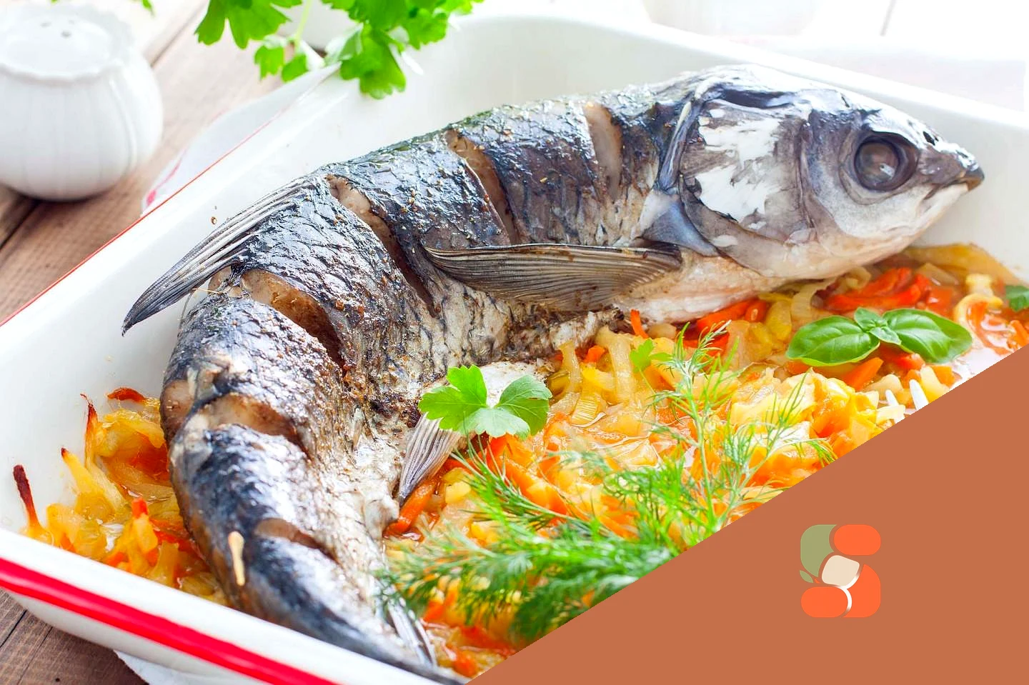 : Візьміть форму для запікання, викладіть в неї подушку з обсмажених овочів, зверху викладіть підготовлену рибу. Закрийте форму фольгою, щоб овочі та риба не пересушилися під час приготування і поставте в попередньо розігріту до 180 градусів духовку на 30 хвилин. Час вказано приблизно орієнтуйтесь на духовку.