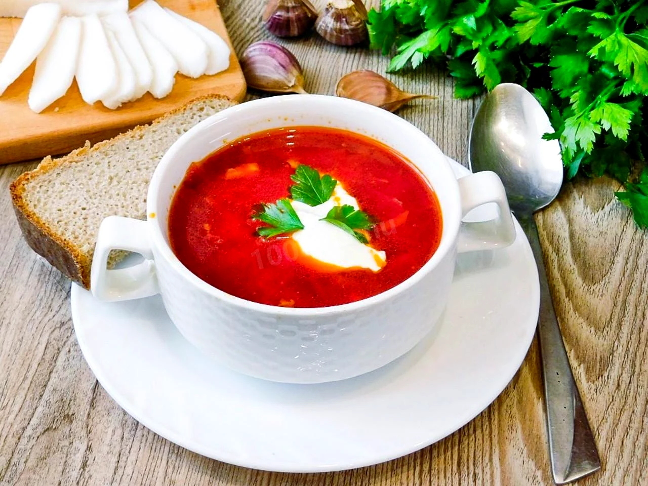 : Потім викладіть смажений буряк у каструлю Додайте лавровий лист і трохи солі на свій смак. Все добре перемішайте. Доведіть до появи перших ознак закипання і одразу вимкніть. У жодному разі не давайте борщу кипіти, інакше він втратить свій насичений колір. Накрийте кришкою і дайте постояти 20-30 хвилин, щоб він настоявся. Подавайте борщ у гарячому вигляді, додавши до тарілки до нього трохи сметани. Приємного апетиту!