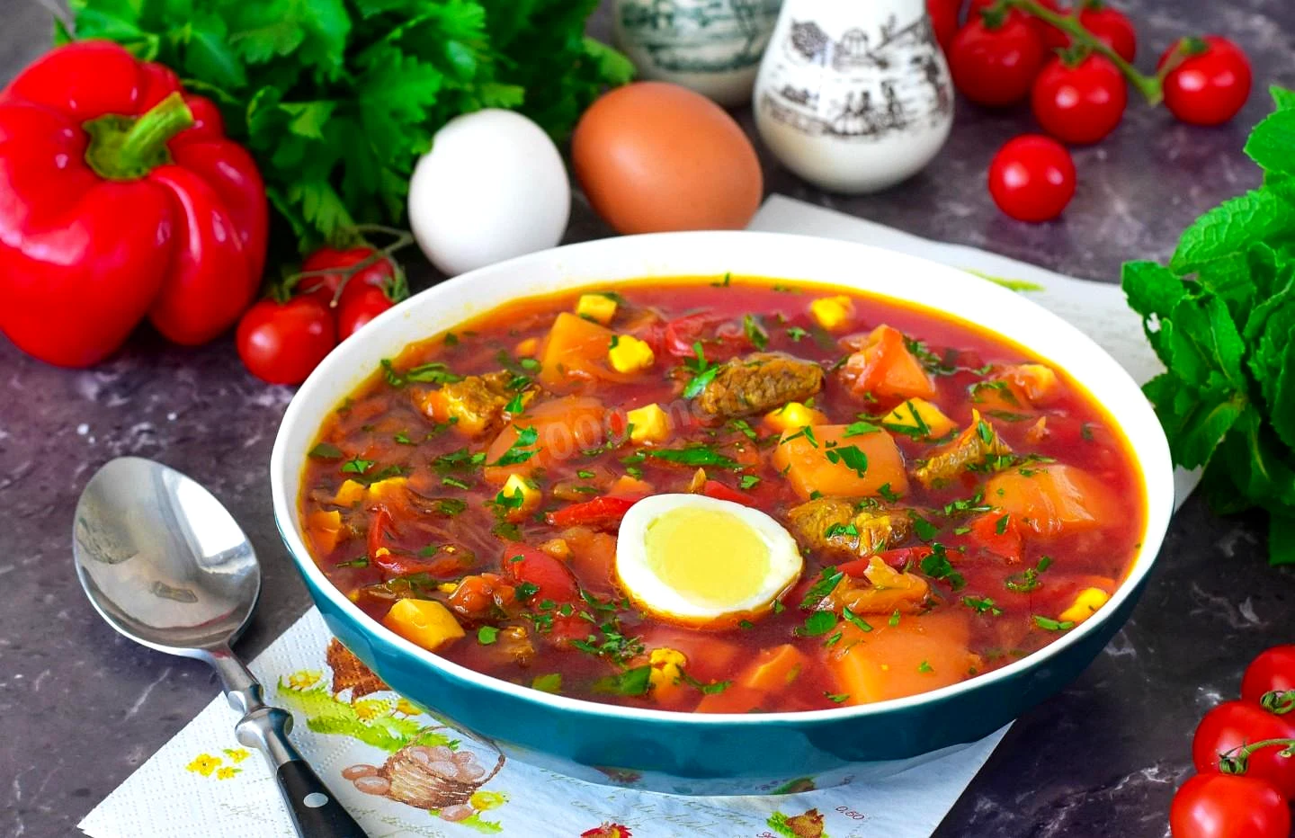 : Накрийте кришкою каструлю і дайте борщу настоятися 15 хвилин Потім розлийте по тарілках та подайте до столу. Приємного апетиту!