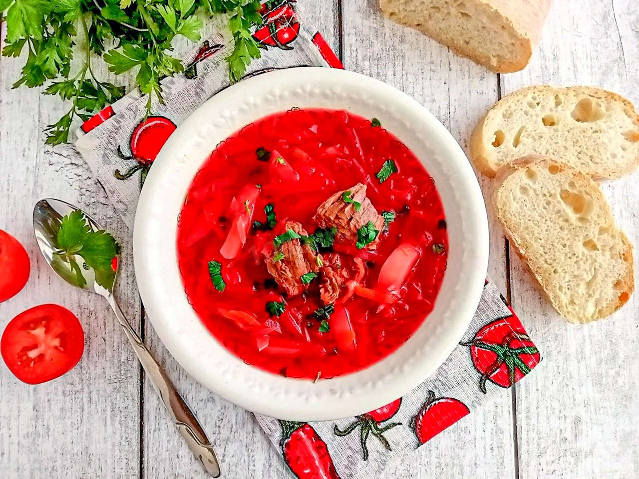 : Подавайте борщ горячим со свежей зеленью и сметаной. Приятного аппетита!