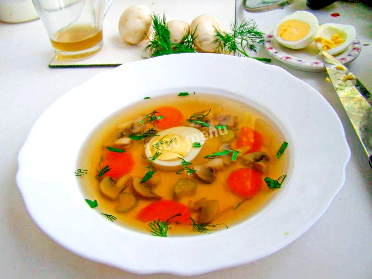 : Використовуйте далі грибний бульйон, як намітили Оскільки в мене це була самостійна страва, я нічого, крім цибулі, не виймала з тарілки та прикрасила бульйон зеленню та відвареним яйцем.
