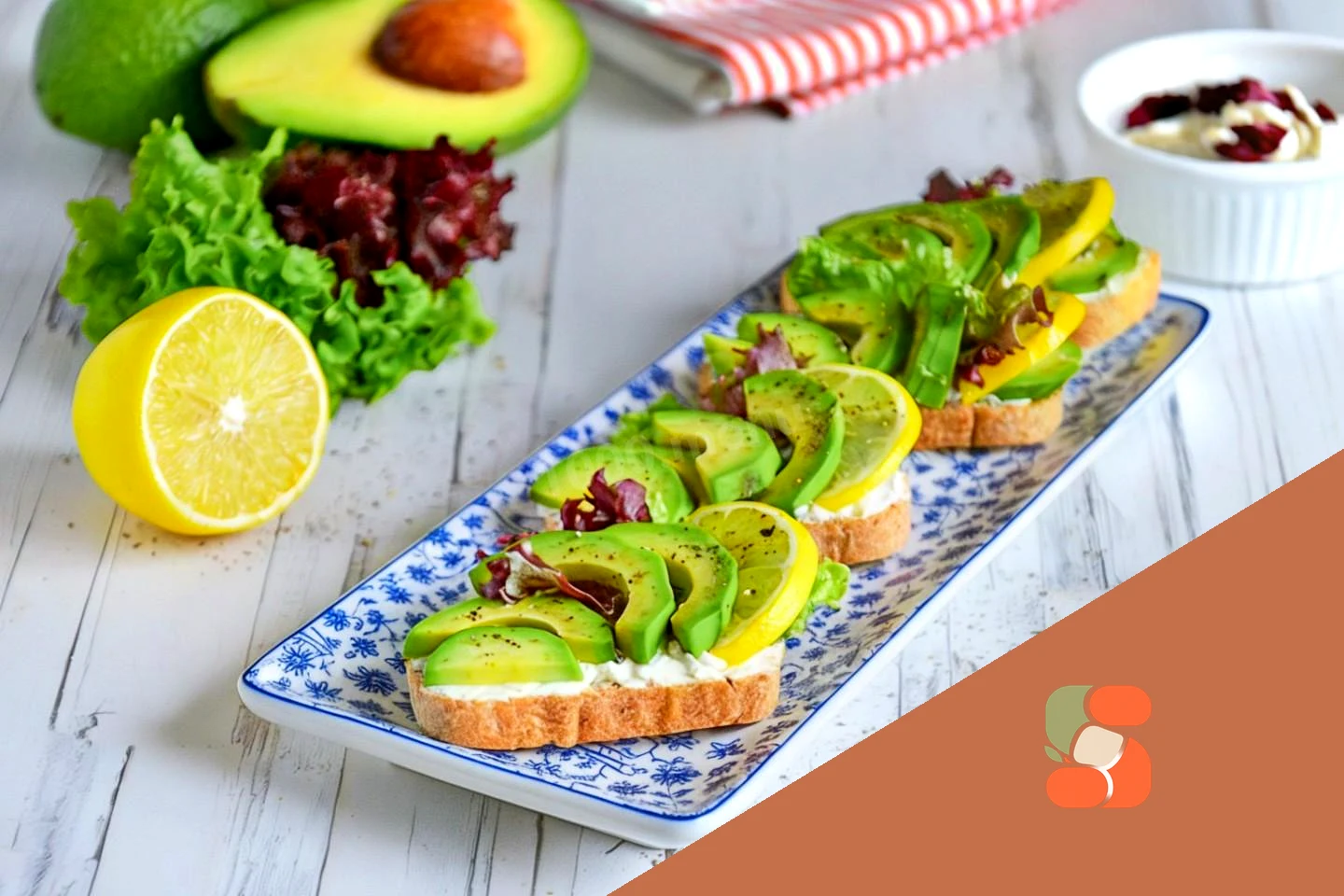 : Викладіть скибочки авокадо на сирний сир На кожен бутерброд додайте по скибочці лимона. Посипте бутерброди сіллю та меленим перцем. Прикрасьте листочками салату чи зеленню та подавайте до столу.