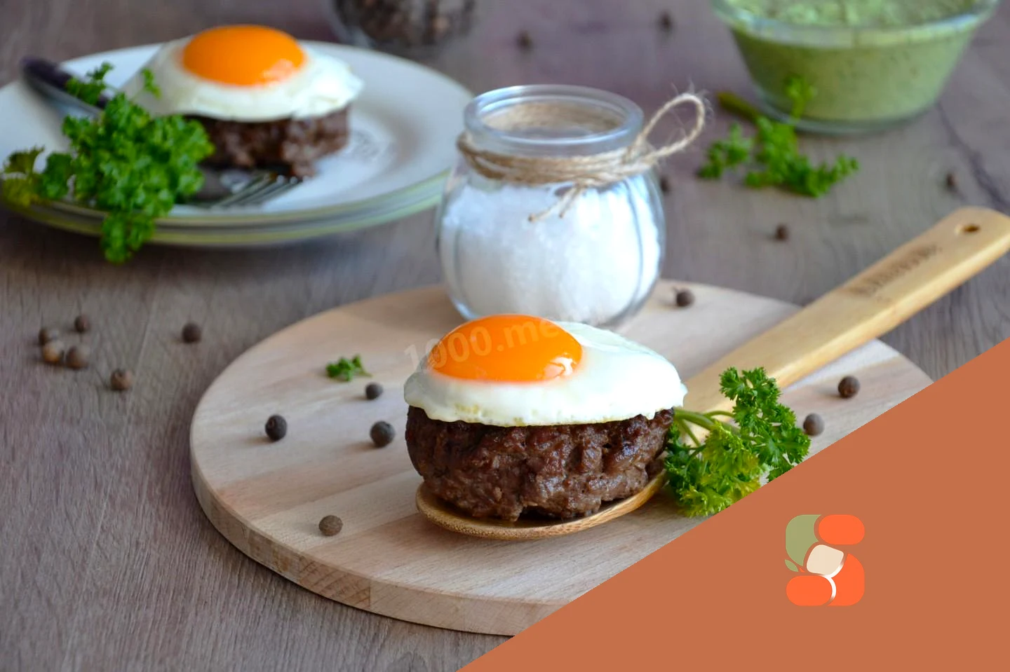 : Окремо посмажте яєчню-глазунью і покладіть красиво на кожен біфштекс Приємного апетиту!