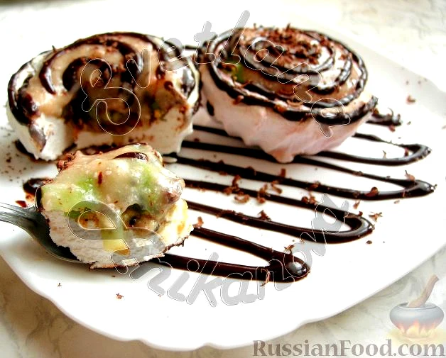 На ківі викладаємо масу з бананів із зефіром та сметаною. Поливаємо зефір з розтопленим начинкою (на водяній бані або в мікрохвильовій печі) шоколадом.