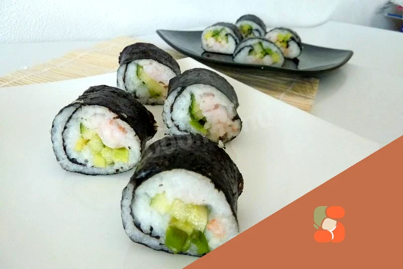 : Згортаємо та нарізаємо. Роли з креветками готові! Їх потрібно їсти, обмазуючи васабі і мачучи в соус, бажано соєвий.