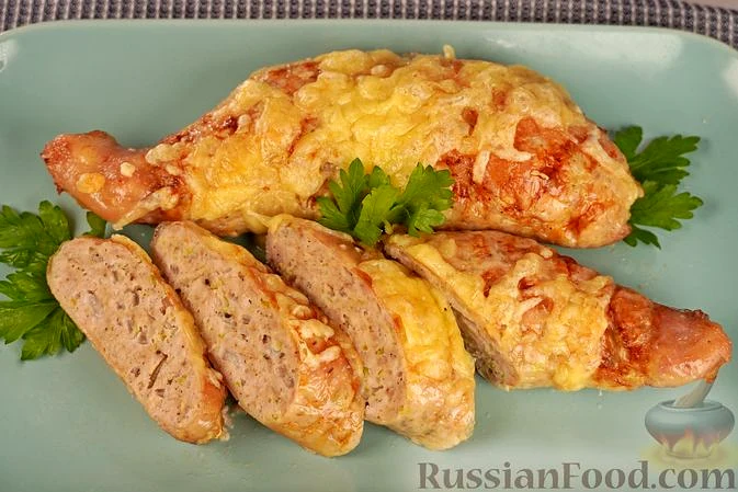 Отриманим фаршем заповнюємо шкіряні панчохи. Краї закріплюємо зубочистками або зшиваємо кулінарними нитками. Викладаємо фаршировані стегенця у форму для запікання.