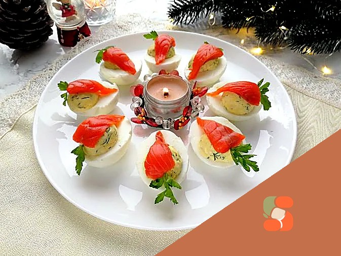 Елегантна закуска з ніжною кремовою начинкою, що манить золотистим відблиском червоної ікри. Кожна половинка яйця — це гармонія м'якого сирного смаку з тонким копійчастим послідсмаком червоної рибки.…