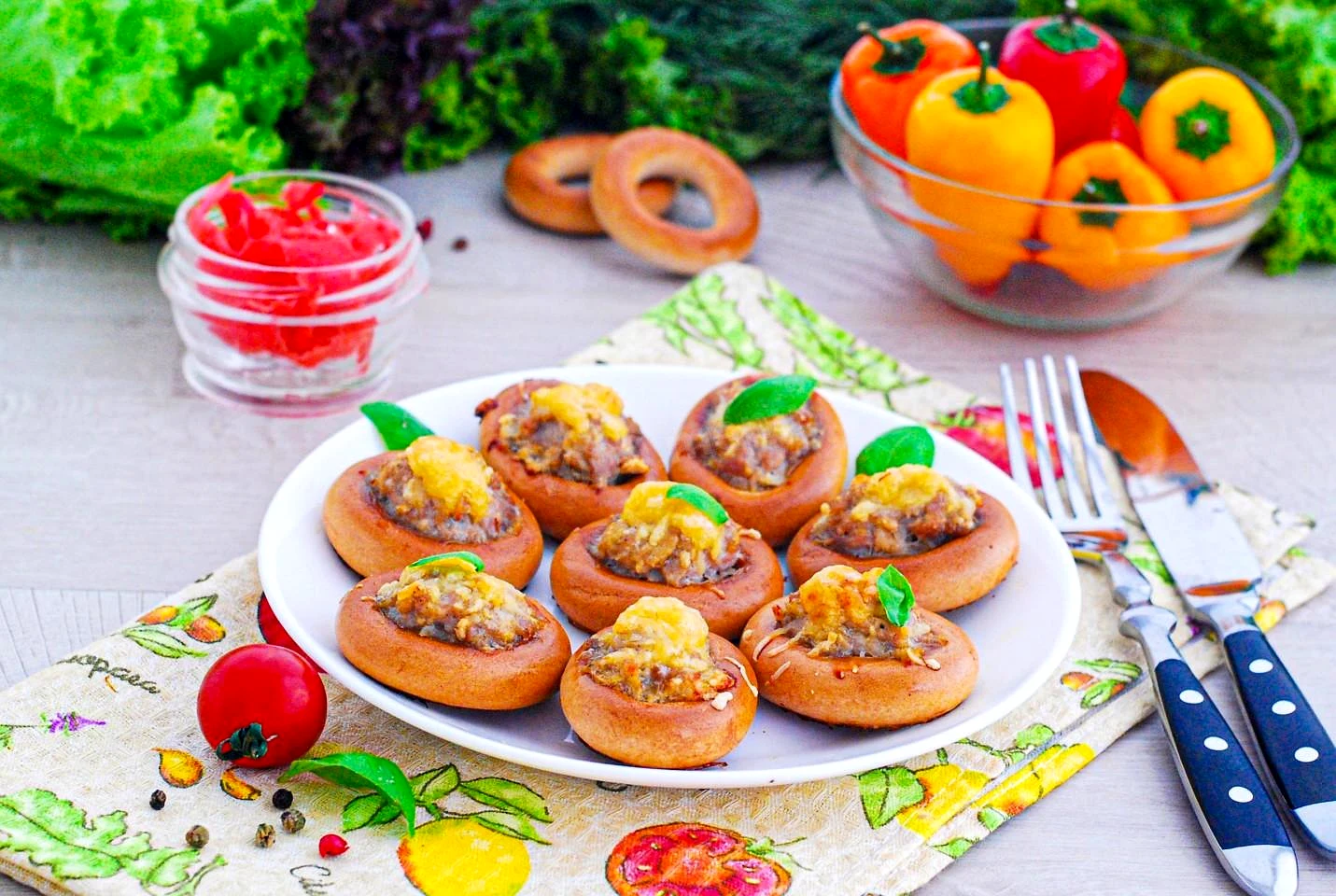 : Точное время определяйте по своей духовке. Готовые теплые фаршированные бублики можно выложить на блюдо с листовым салатом, украсить листиками петрушки или базиликом. Подавайте со свежими овощами, зеленью, аджикой, соусами.