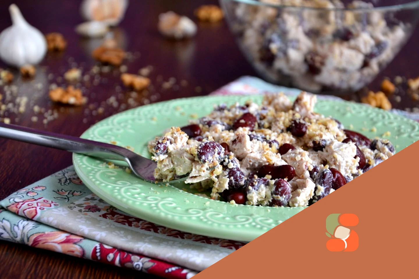 : У салатнику з'єднайте куряче філе, квасолю, рубані горіхи та сметану.