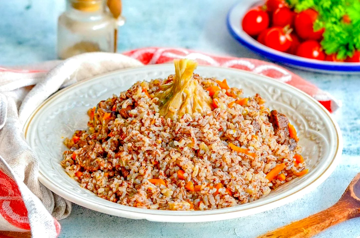 Как правильно добавить рис в зирвак? С риса предварительно слейте воду. Рис выкладывайте очень аккуратно сверху мяса. Затем также аккуратно, через шумовку долейте в казан воду. Вода должна быть на пару сантиметров выше риса. Опять посолите и приправьте специями. Не перемешивайте! Оставьте на сильном огне вариться до выкипания воды.