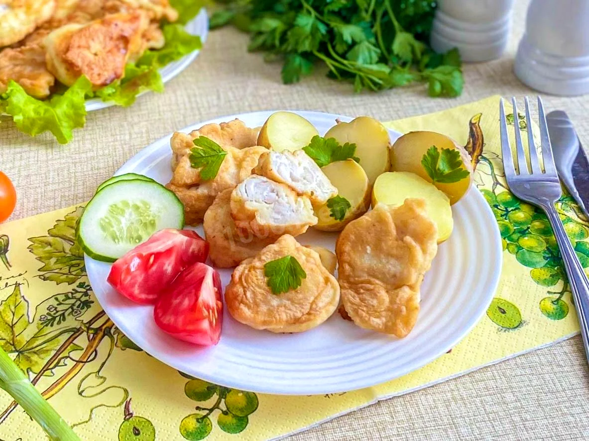 : Готовую рыбу переложите на тарелку, застеленную салфеткой, чтобы удалить лишнее масло. Хек в кляре готов. Приятного аппетита!