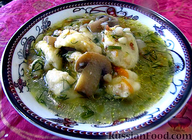 Гречаний суп з грибами та картопляними галушками