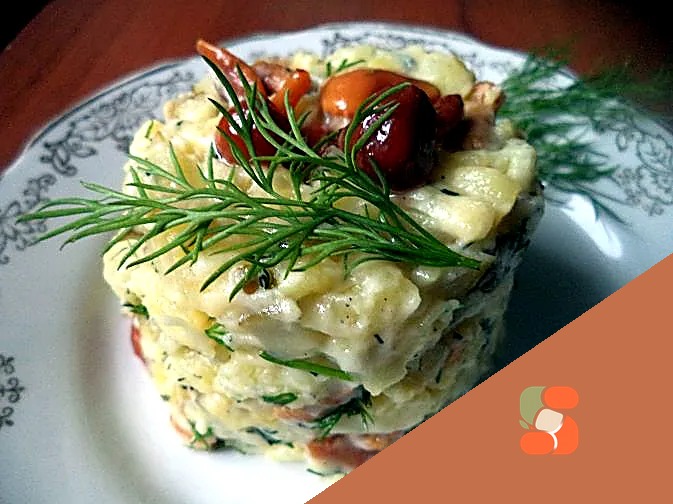 Ніжна та витончена закуска, що таємниче об'єднує землистий смак лісових грибів з ніжною кремовістю. Цей салат вражає ніжно-золотистим кольором і невагомою текстурою, яка буквально тане на язику. Ідеа…