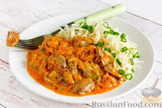 # Гуляш із куриних сердечок Ніжна, товста підлива з томатами та паприкою обволікає мяккі шматочки куриних сердечок, які тануть у роті. Гарячий гуляш із глибоким, насиченим смаком і легким пікантним п…