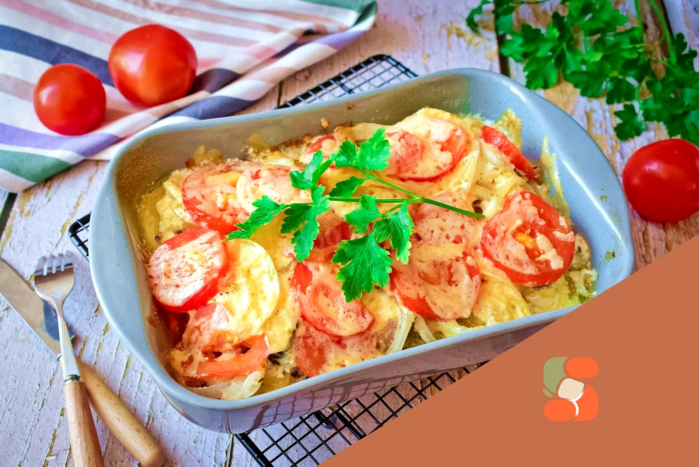 : Помідори помийте, наріжте кружальцями і викладіть по сметані