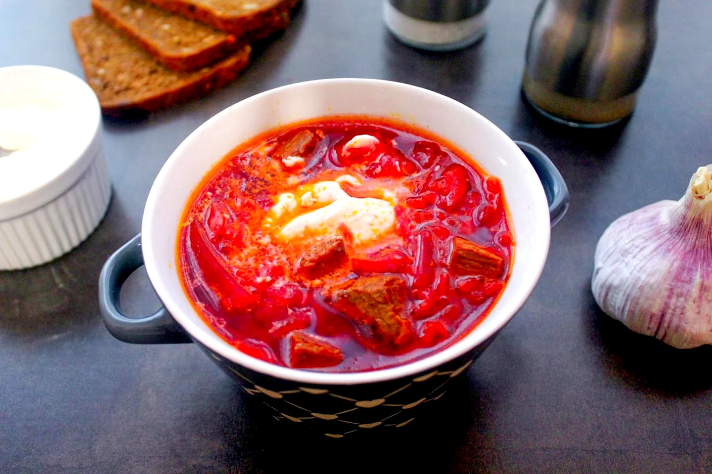 : Коли капуста стане м'якою, додайте в каструлю засмажку, кубики яловичини, всипте цукор, влийте оцет і сік з-під маринованих буряків. Дайте супу ще трохи прокипіти, після чого нагрівання вимкніть і дайте борщу настоятися під кришкою близько 15 хвилин. Потім розлийте його по тарілках, за бажанням додайте сметану і подавайте до столу. Приємного апетиту!