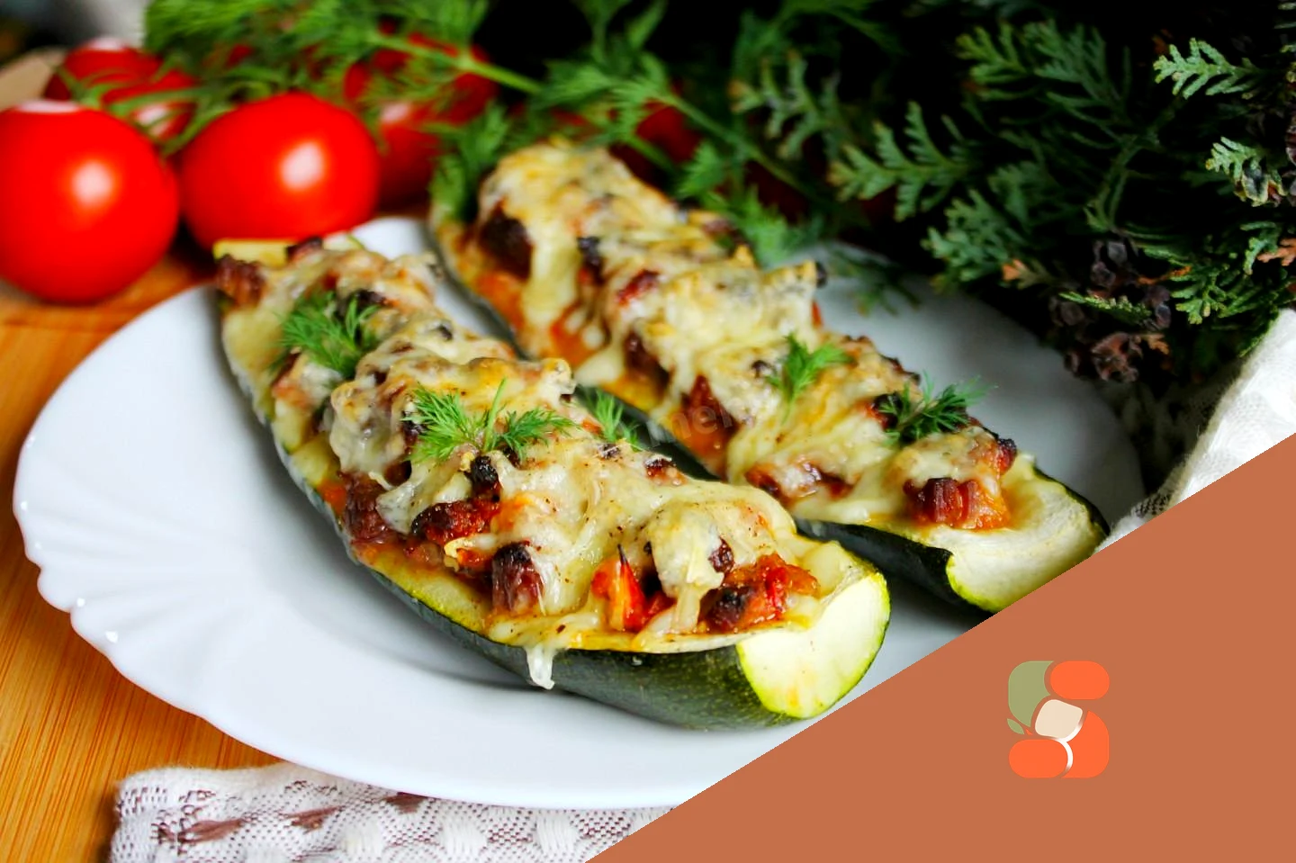 : Готові кабачки з яловичиною та помідорами вийміть з духовки, поперчіть за смаком запашним перцем і прикрасьте свіжою зеленню. Подавайте гарячими.