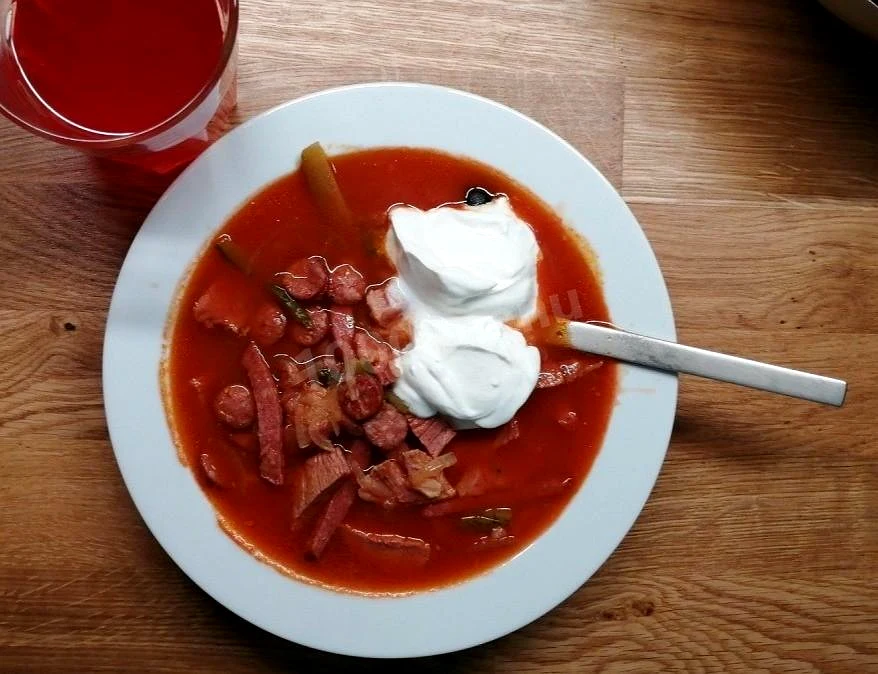 Інгредієнти−12 порцій+Продукти (12 порцій)Яловичина500 грКовбаса300 грЦибуля ріпчаста2 шт.Мариновані огірки4 шт.Лимони0.5 шт.Маслини50 грТоматна паста4 стол.л.Лавровий лист2 шт.Перець горошком10 шт.Рослинна олія1 стол.л.