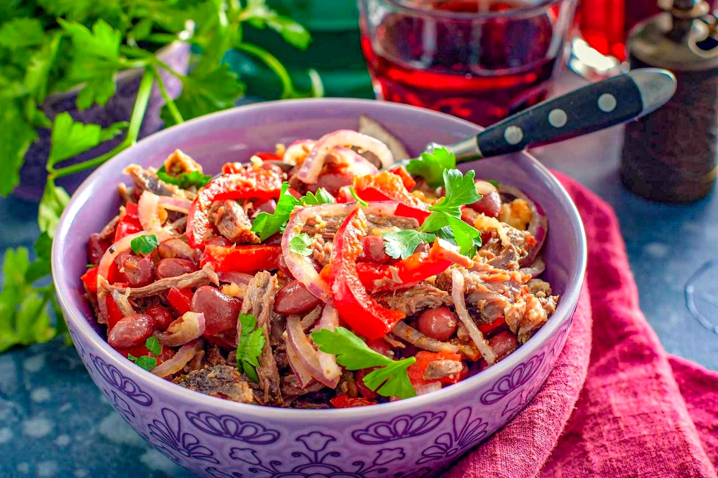 Як зробити салат з червоною квасолею, болгарським перцем та яловичиною грузинську? Підготуйте інгредієнти. У мене фіолетова цибуля. Замість нього можна взяти звичайний ріпчастий чи білий. Завчасно відваріть яловичину. Для цього закип'ятіть воду в каструлі та опустіть м'ясо в окріп. Так яловичина залишиться м'якою та соковитою. Варіть м'ясо близько 1,5 години, в кінці додайте сіль і спеції за смаком. Готову яловичину остудіть. Яку частину яловичини краще обрати для відварювання? Найкраще підходять нежирні та ніжні частини: вирізка, товстий або тонкий край.