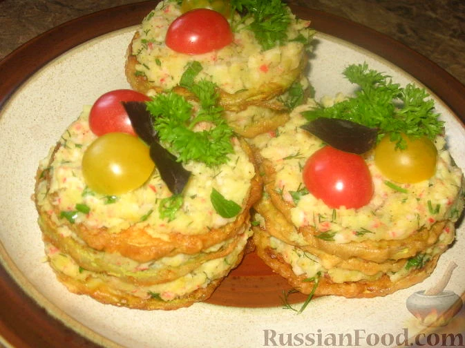 Збираємо листкову закуску з кабачків. На кружальце кабачка викладаємо 1 ст. ложку (повну) картопляно-крабового пюре та розрівнюємо. Так чергуємо кілька шарів.