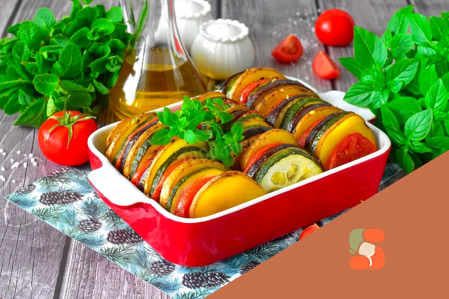 : У форму для запікання викладіть, чергуючи, скибочки картоплі, баклажанів, помідорів та кабачків. Про різні форми для випікання читайте у статті наприкінці цього рецепту під кроками.