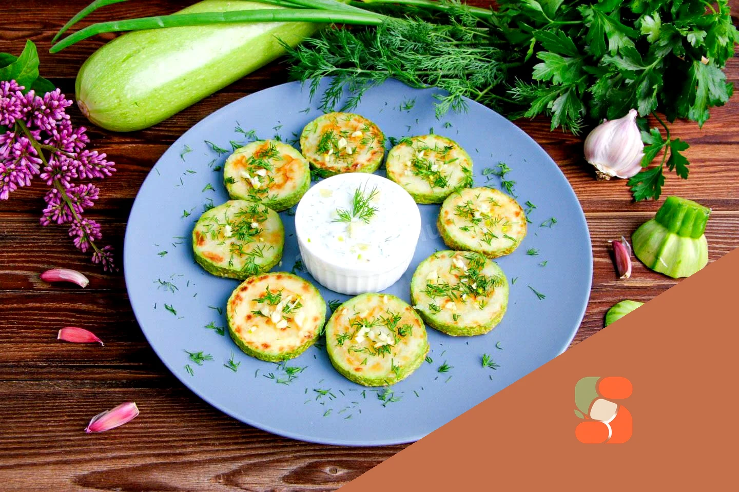 : Готові скибочки відразу знімайте на блюдо для подачі Поки вони гарячі, посипте їх дрібно нарізаним часником та кропом. Окремо подайте сметанний соус: до сметани також додайте нарізаний часник з кропом, посоліть за смаком і перемішайте. Аналогічно посмажте наступну порцію кабачків, обов'язково підлийте на сковороду олії, тому що кабачки сильно вбирають його під час смаження.