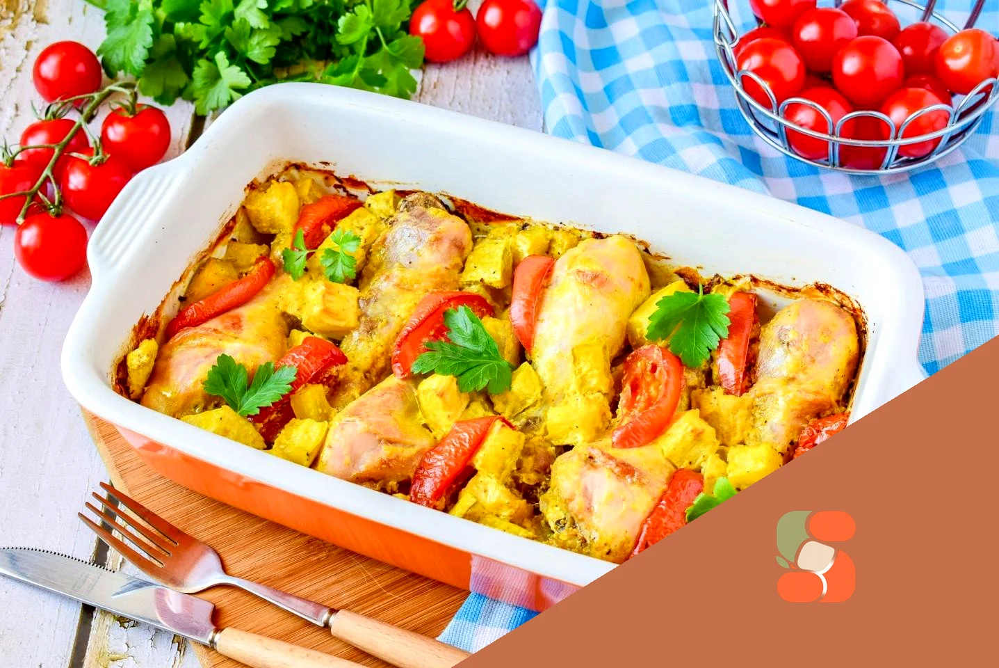: У проміжках розкладіть нарізані помідори Накрийте форму фольгою і поставте в духовку, розігріту попередньо до 180 градусів, на 45-60 хвилин. При запіканні орієнтуйтеся по своїй духовці.