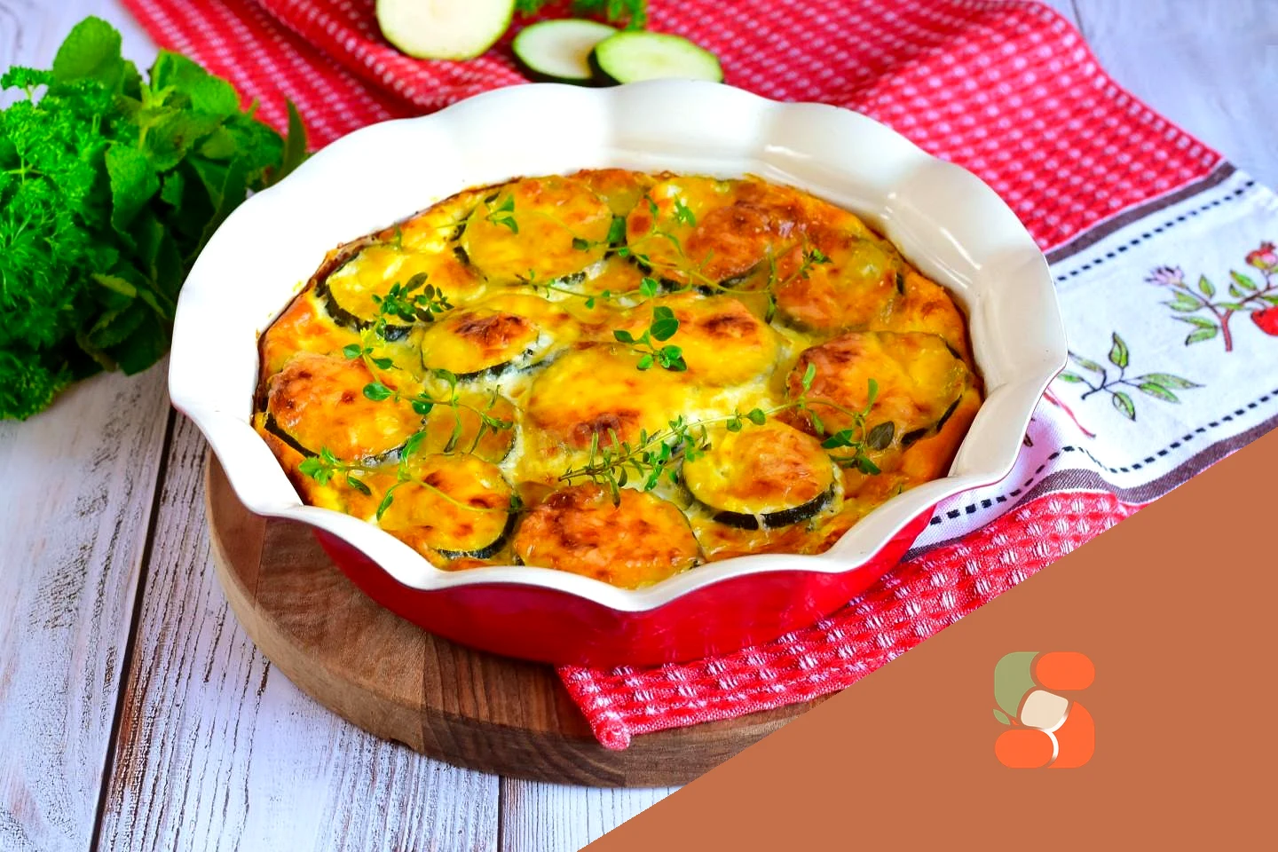 Як зібрати запіканку у формі? Форму для запікання діаметром 24-26 см змастіть олією. Викладіть кружечки кабачків у кілька шарів. Зверху залийте кабачки омлетною сумішшю. Про вибір рослинної олії читайте у статті під описом рецепту.