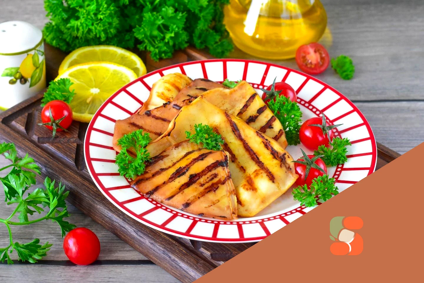 : Готові кальмари на грилі перекладіть на тарілку і подайте до столу в гарячому або холодному вигляді, прикрасивши зеленню. Приємного апетиту!