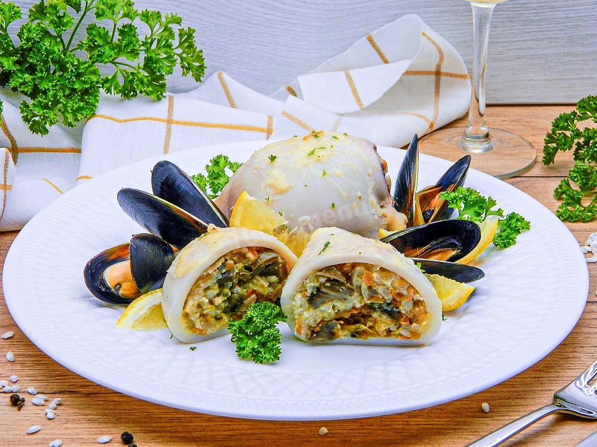 Кальмары фаршированные грибами рисом и сыром в духовке