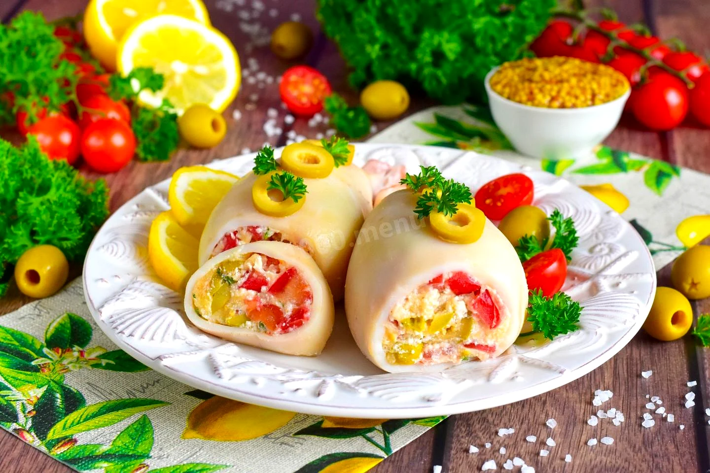 : Готовые фаршированные кальмары переложите на тарелку. Украсьте блюдо оливками, свежей зеленью, помидорами черри и подайте к столу. Приятного аппетита!