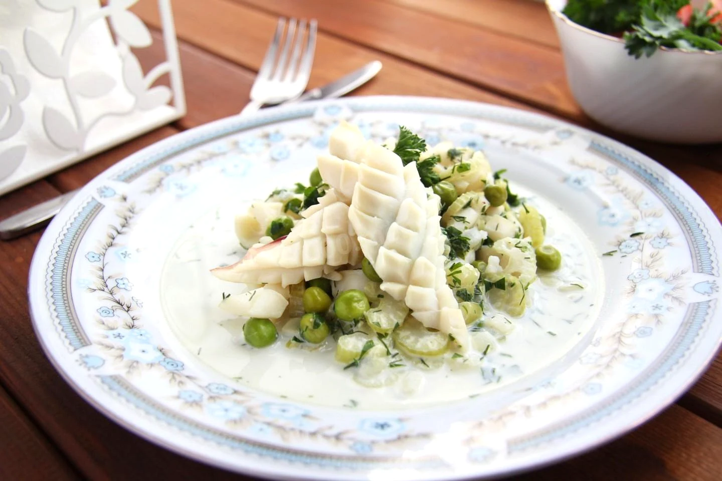 : Кальмар очистите от внутренностей и кожи, а также удалите хорду. Я предпочитаю выбирать уже очищенного кальмара, но всё равно, его нужно просмотреть на предмет наличия хорды.