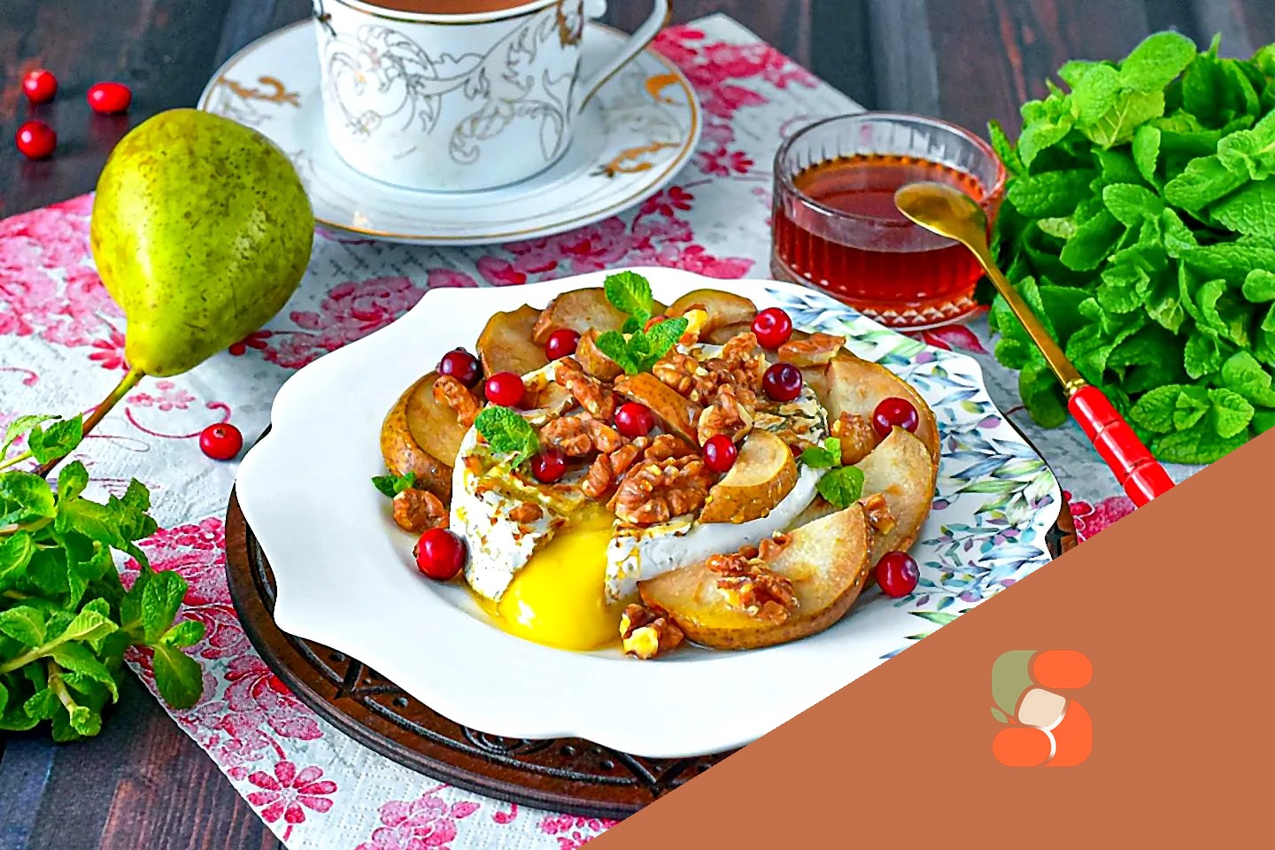 Як подати грушу з камамбером, запечену в аерогрилі? Камамбер з грушею в аерогрилі перекладіть на тарілку, полийте медом, що залишився, прикрасьте журавлиною і м'ятою і подайте до столу. Приємного апетиту!