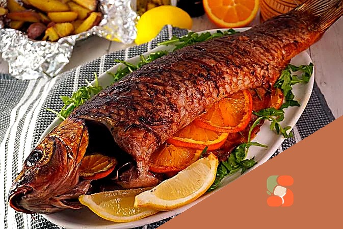 Подаємо запеченого коропа до столу, прикрасивши часточками апельсина.