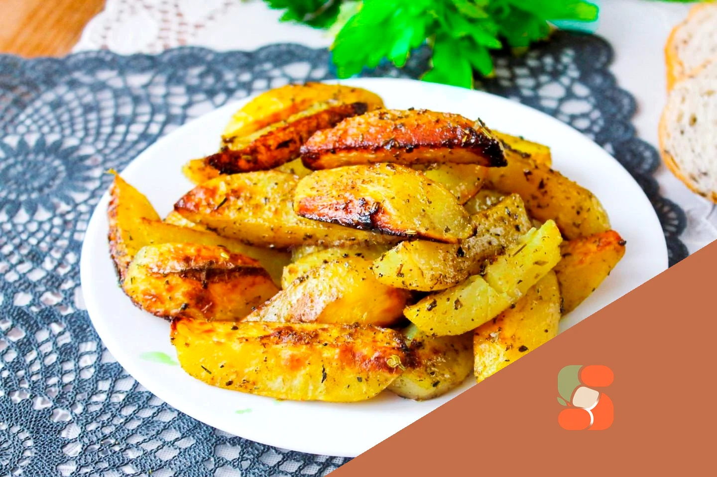 : Запечена в духовці картопля вийшла неймовірно апетитною та ароматною Подавайте картопляні часточки з хрусткою скоринкою в гарячому вигляді до м'яса чи риби. Перед подачею картоплю можна посипати подрібненим кропом. Можна полити часниковою олією. Для цього в невеликій ємності змішайте олію і пропущений через прес часник (2-3 зубчики). Приємного апетиту!