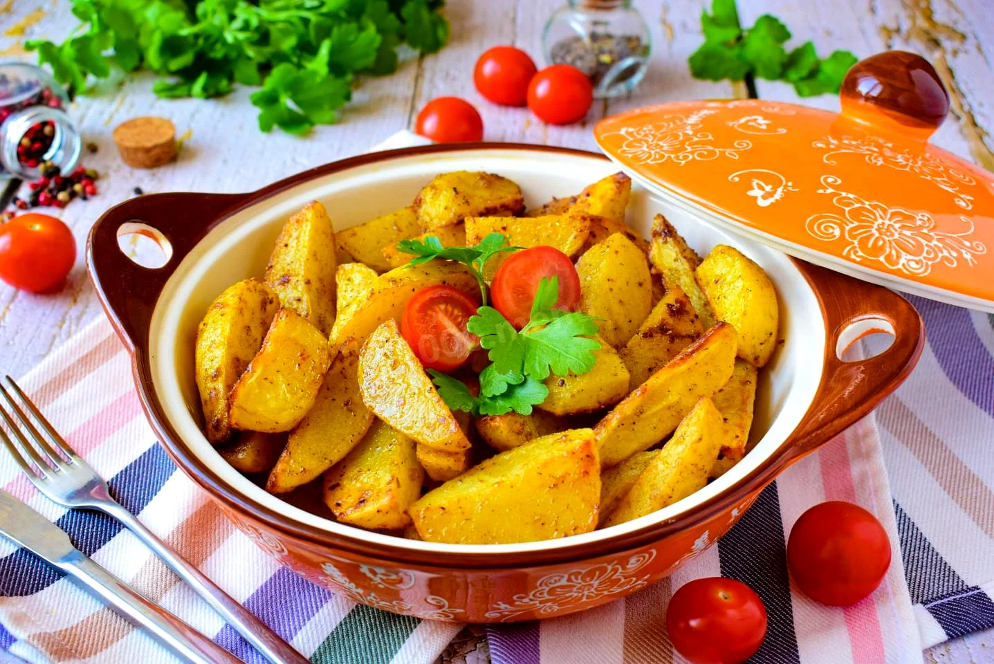 : За час запікання орієнтуйтеся за духовкою. Готова картопля стане м'якою і трохи підсмаженою. Вийміть лист з духовки, перекладіть всю картопля на блюдо і подавайте до столу.