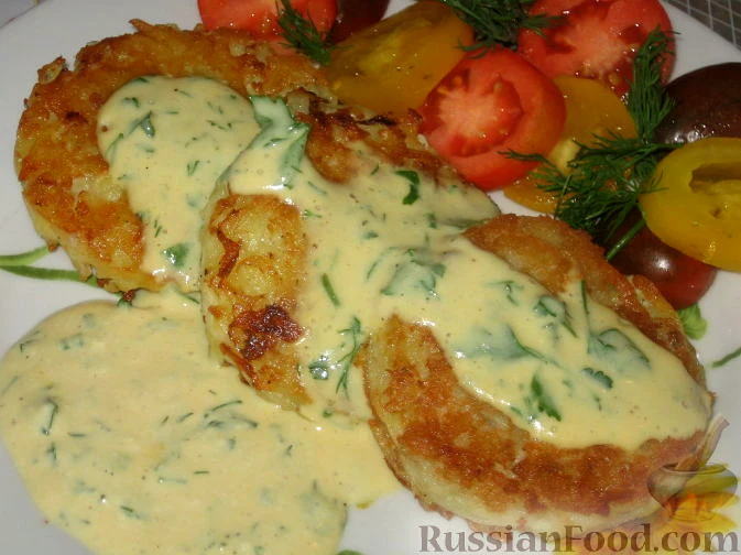 Викладемо картопляно-рибні оладки на тарілку, поллємо гірчичним соусом. До оладок можна приготувати салат із помідорів. Смачного!