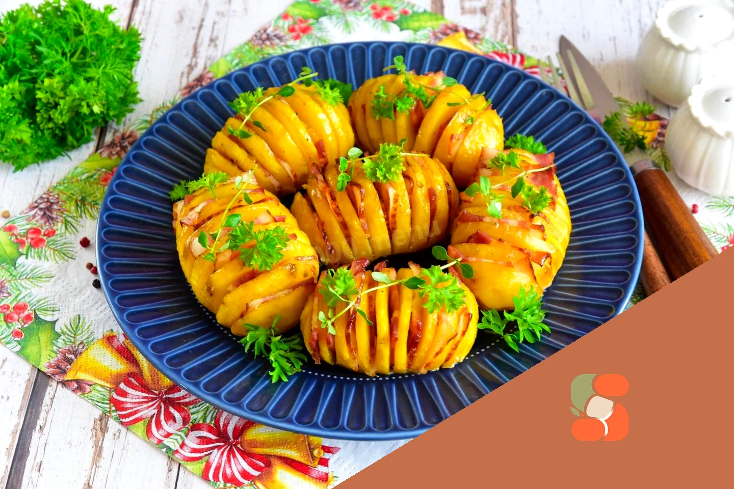 : Картоплю посипте сухим часником, сіллю та перцем, намагаючись, щоб спеції потрапили в надрізи.
