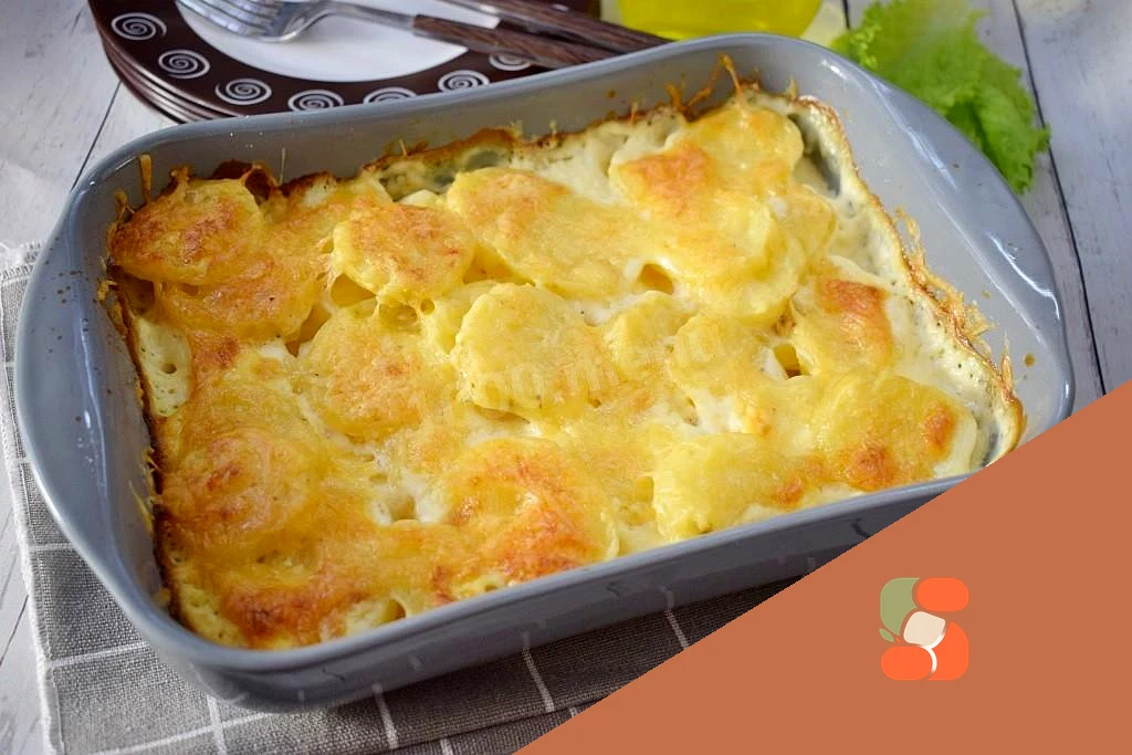 : Верх рясно засипте тертим сиром. Форму з картоплею поставте в духовку, нагріту до 180 градусів, на 40 хвилин. За цей час картопля повністю приготується та просочиться вершками. А сир зверху розплавиться та стане золотистого кольору.