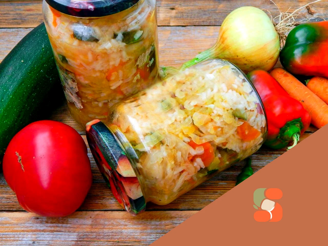 : Кашу з овочами розкладіть по банках Банки поставте в каструлю з водою і ганчірочкою на дні, накрийте кришкою каструлю. Стерилізуйте ці баночки близько 10 хвилин. Закрутіть банки гарячими. Залишіть їх остигати догори дном за кімнатної температури. Укутувати їх не потрібно, інакше рис сильно розвариться, а овочі стануть надто м'якими. Зберігайте банки у холодній коморі до зими. Приємного апетиту!