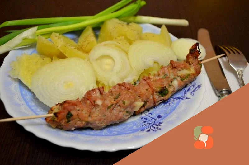 : Готові кебаби я нанизую на шпажки На тарілку викладаю запечену картопля, люля-кебаб і доповнюємо кулінарну композицію ріпчастою та зеленою цибулею.