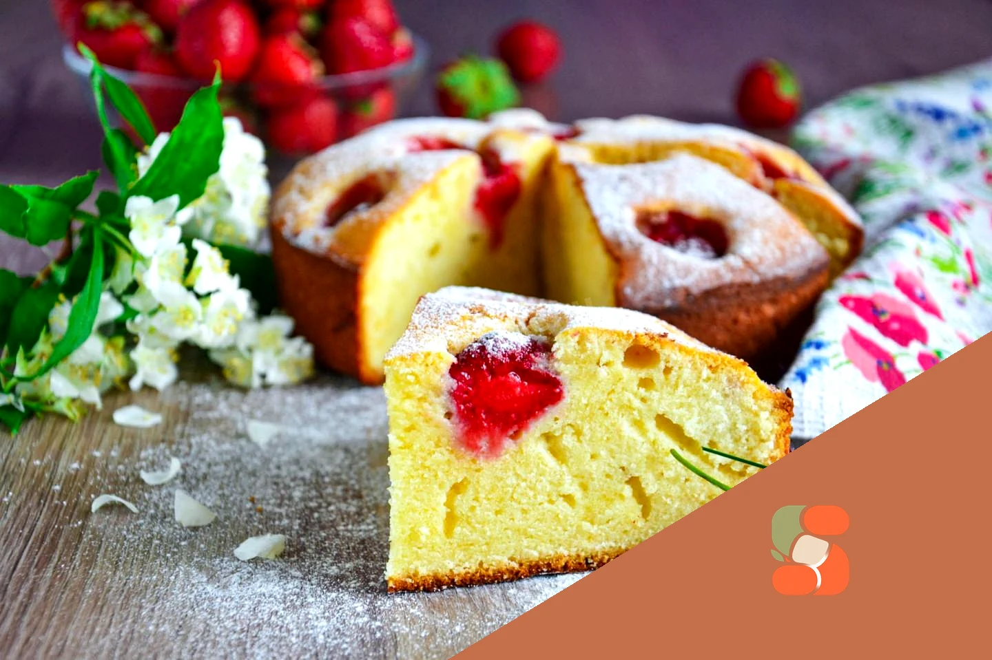 : Зверху розподіліть полуницю. Випікайте кекс у розігрітій до 180 ° С духовці близько 35 хвилин. Коли верхній шар трохи підрум'яниться, перевірте кекс на готовність: проткніть дерев'яною шпажкою в декількох місцях, якщо шпажка вийде сухою, значить форму можна діставати з духової шафи.