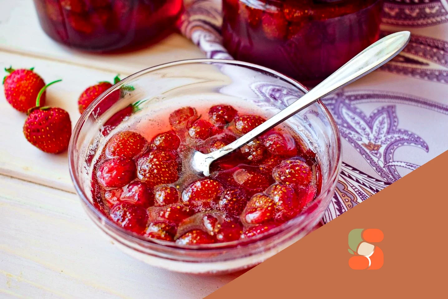 : Через кілька годин полуницю нагрійте, щоб розчинився цукор А потім злийте з ягід сік, що утворився, і доведіть його до кипіння. Додайте цукор, що залишився. Проварити сироп протягом години на невеликому вогні. Щоб сироп виходив густішим, час його варіння можна трохи збільшити.