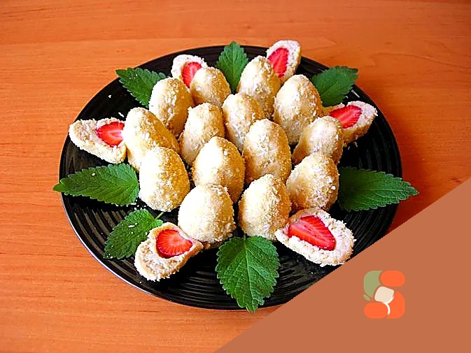 Обвалюємо сирні цукерки з полуницею у приготовленій суміші.