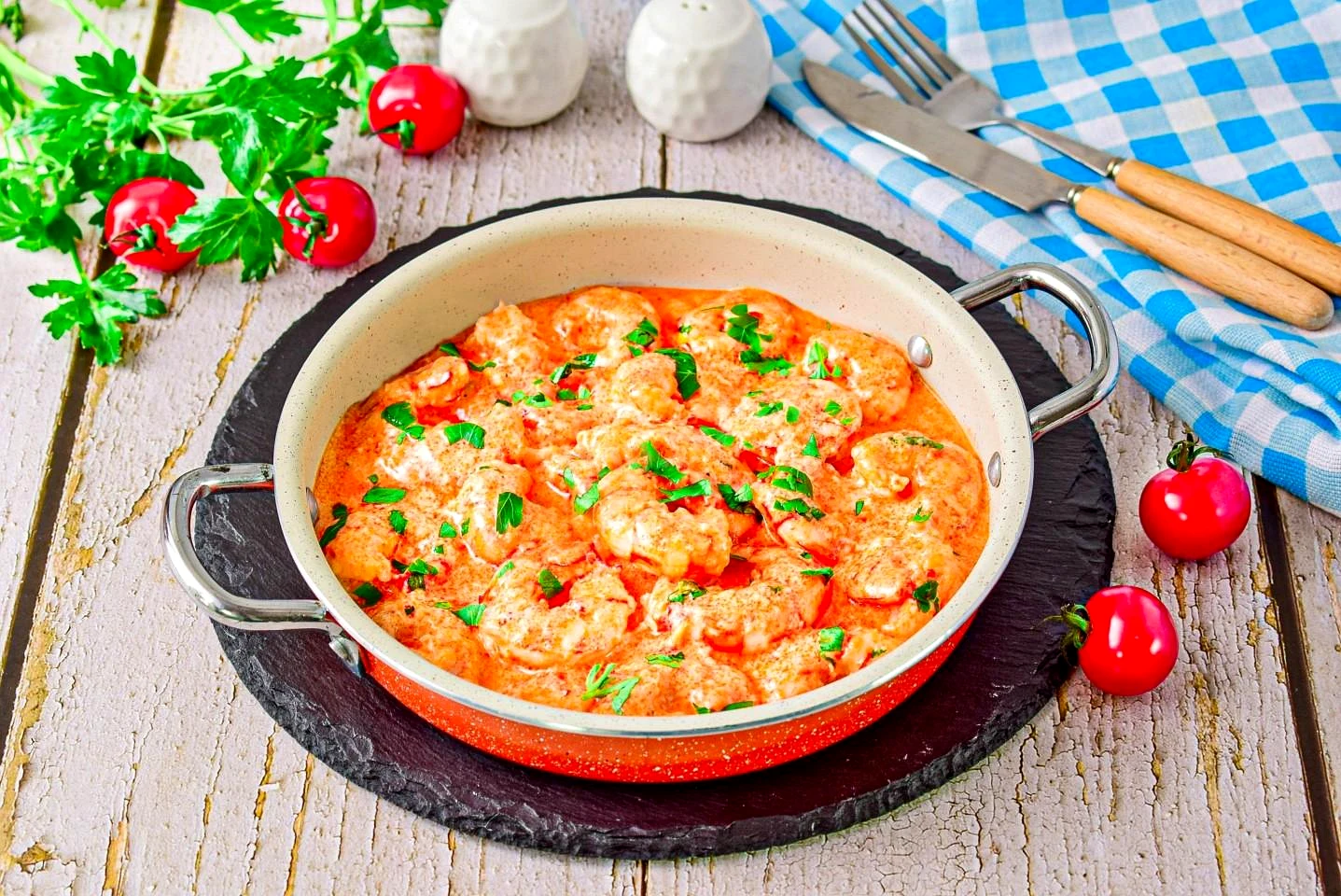 Креветки на сковороде в сливочном соусе