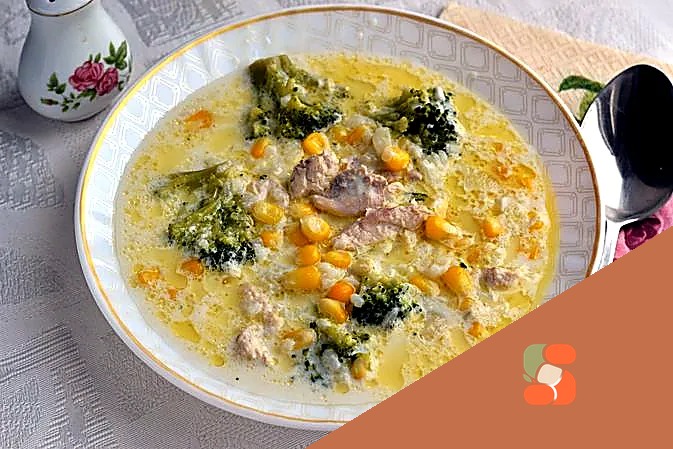 # Куриний суп з брокколі, рисом, кукурузою та молоком Ніжний та ситний суп, який дарує організму тепло й комфорт. Кремова молочна основа гармонійно поєднується з ніжною куркою, яскравою брокколі та с…