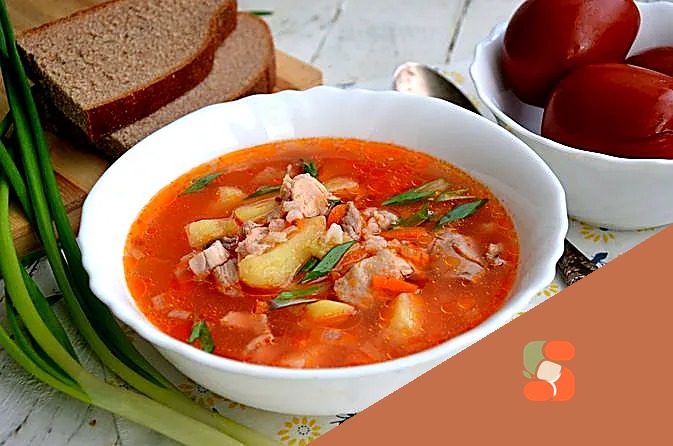 # Куриний суп з солоними помідорами й рисом Ароматний й насичений суп, що поєднує м'ясистість курки з пікантною кислинкою маринованих помідорів та ніжністю варених зернушок рису. Золотавий бульйон з …