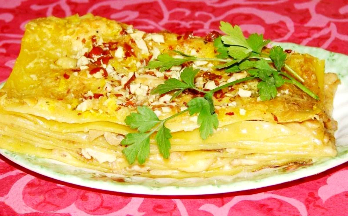 : Готову страву виймаємо з духовки та подаємо до столу, прикрасивши свіжою зеленню. З форми лазанню не виймаємо, нарізаємо її на порції у формі.